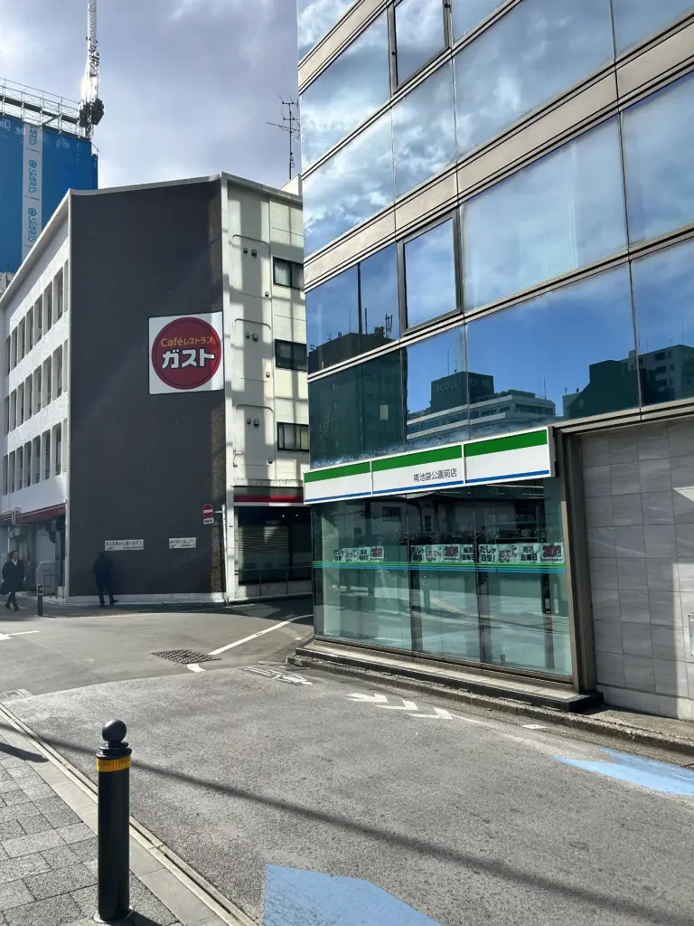 ブルーボトルコーヒーの並びには、ァミリーマート。さらに奥にはガスト。